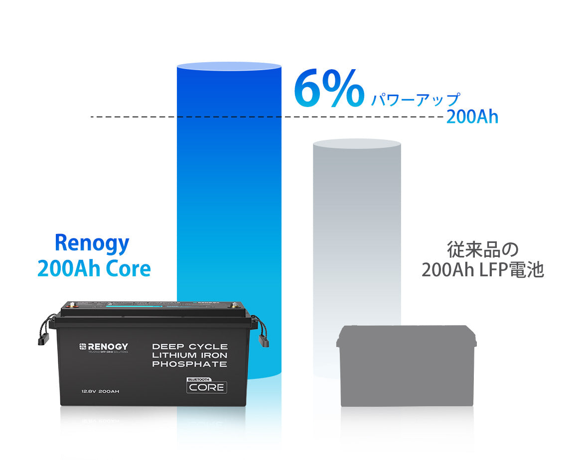 • 【最大6%向上した実用容量】Renogy 12V 200Ah Coreシリーズバッテリーは、定格容量に対して最大6%多い実用容量を実現し、最大212Ahの電力供給が可能です。より長時間の安定した使用をサポートします。