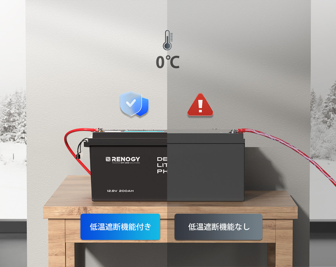 • 【高信頼BMSによる多重保護設計】200A対応の高信頼BMSを内蔵し、高電流放電を安定して制御します。低温時充電遮断機能を備えており、冬季でも安全な充電と長期的な性能維持を実現します。