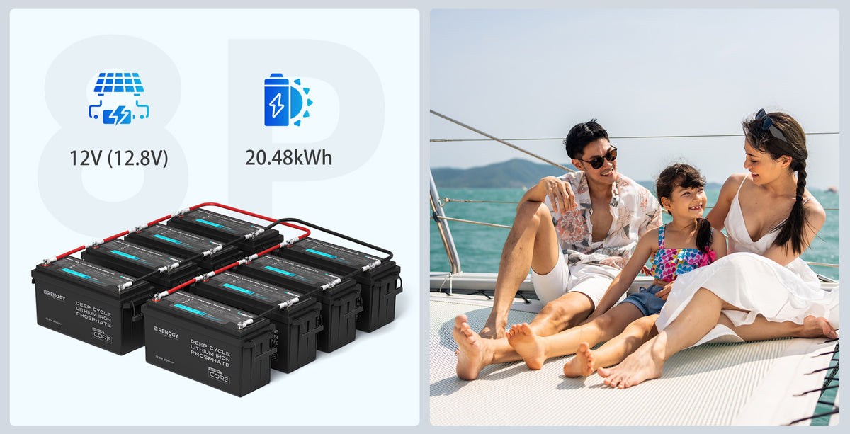 バッテリーを並列接続することで、オフグリッド電源の稼働時間を延ばせます。8台接続で最大20.48kWhの電力を確保可能です。