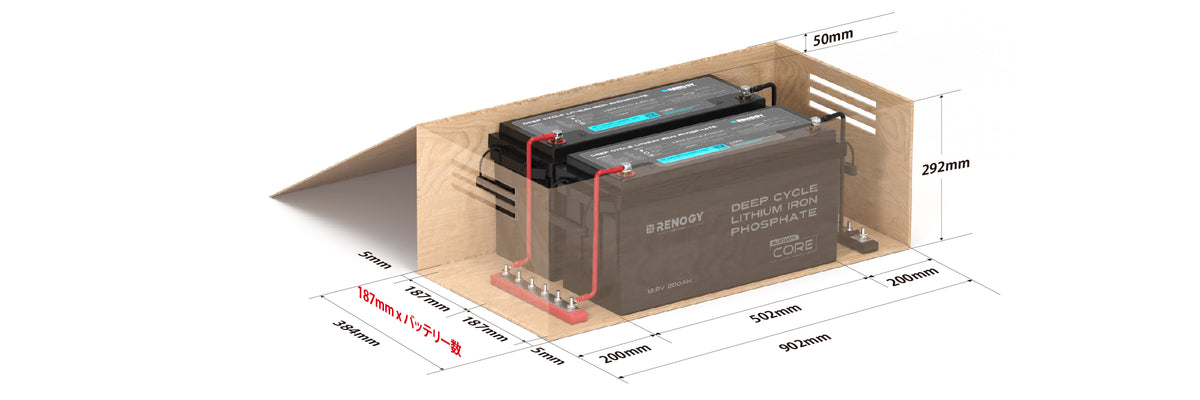 バッテリー上部に50~100mm、バスバー側に200mm以上の空間を確保して設置してください。