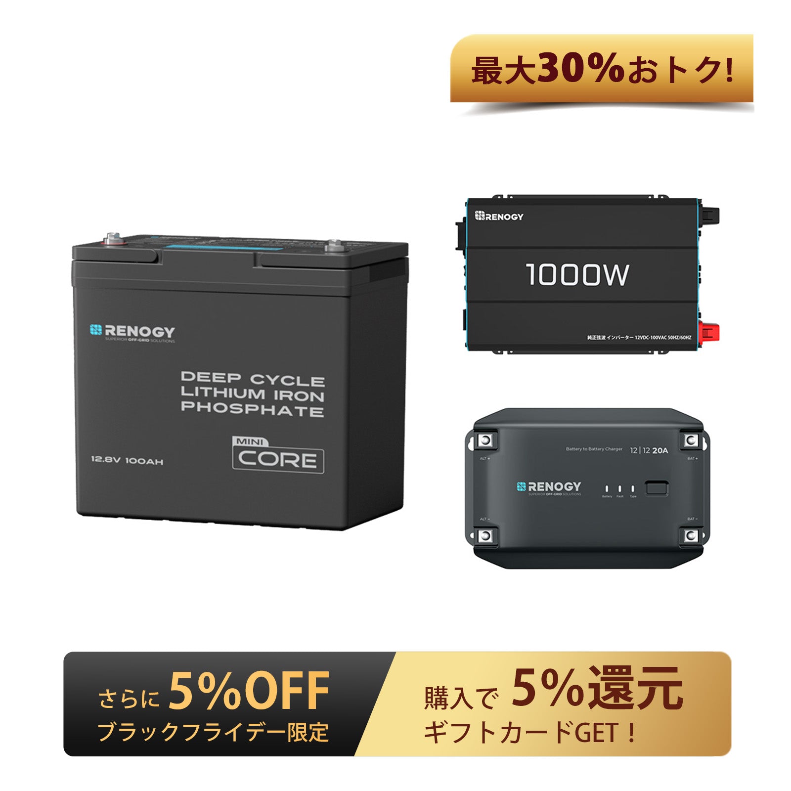 Renogy ヒート機能付き 12V 100Ah Mini リン酸鉄リチウムイオンバッテリー+1000W 12V 純正弦波インバーター+12V 40A DC-DC 走行充電器 セット