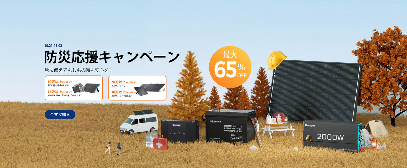 RENOGY JAPANでは、オフグリッド生活を堪能するためのソーラー発電製品を幅広く取り扱っています。チャージコントローラーやソーラーパネル、高性能な走行充電器やリン酸鉄リチウムイオンバッテリーまで、充実のラインナップ。「エネルギー自給を全ての人々に」の実現に向け、皆様にワクワクしてもらえるようなオフグリッド製品の開発に尽力します。