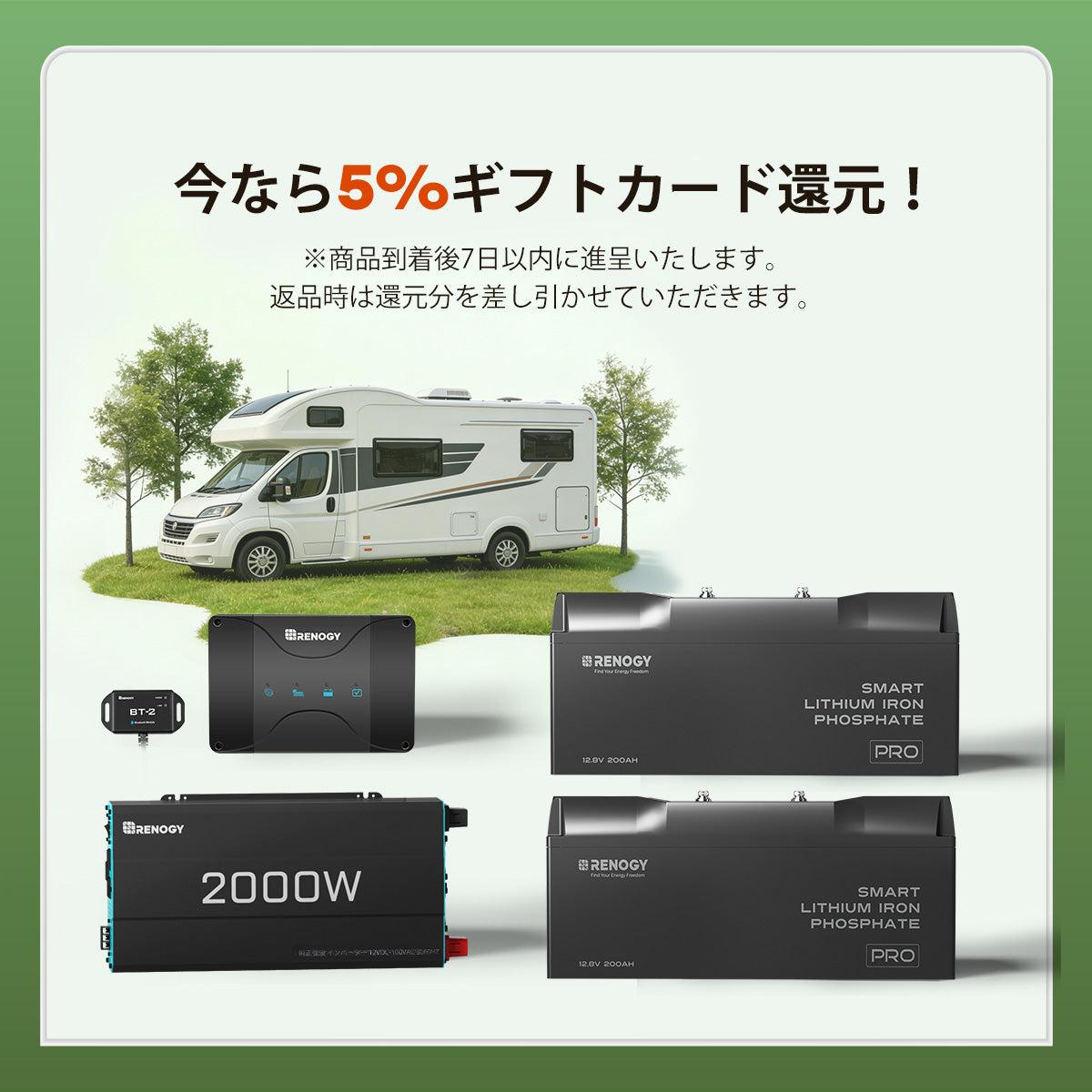 400Ah パワーキット|200Ahヒート機能付きリン酸鉄リチウムイオンバッテリー×2+2000Wインバーター+50A DCC 走行充電器