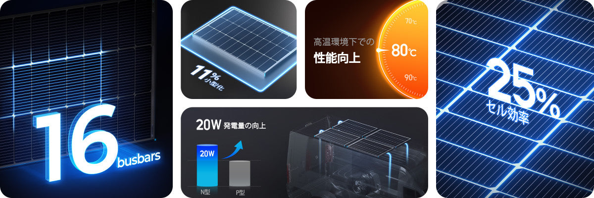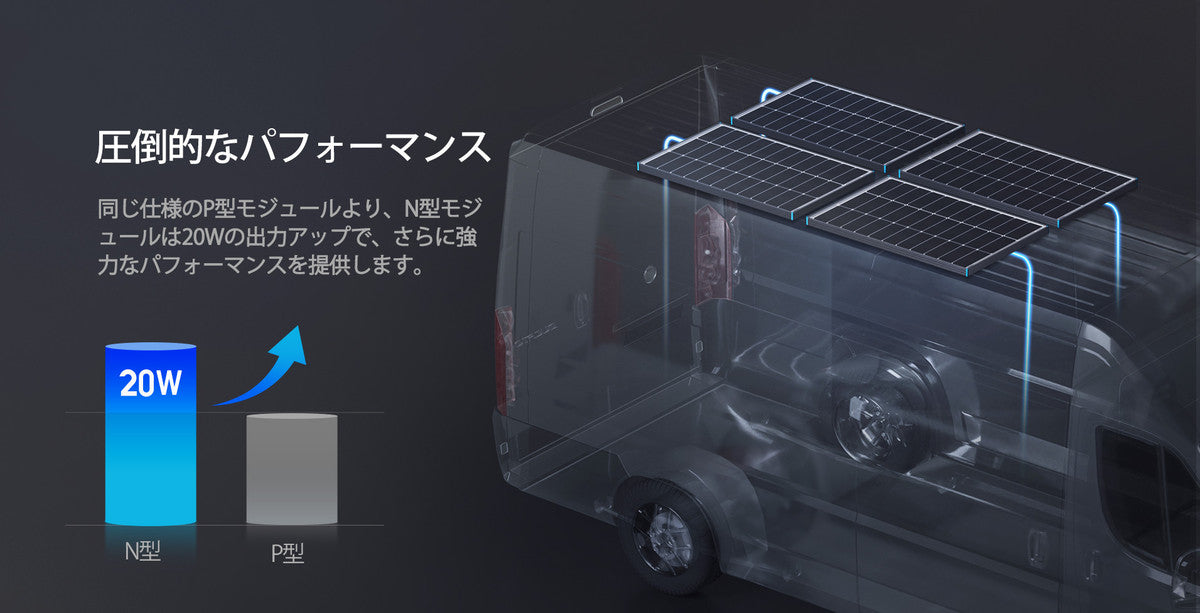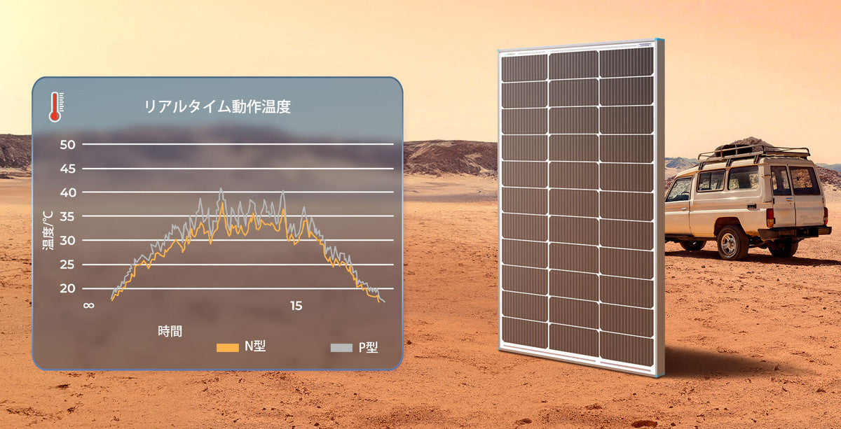 従来のP型に比べて低い温度係数を持ち、モジュール表面温度の上昇による発電効率の低下を抑制します。高温環境でも安定した性能を発揮し、オフグリッド用途に最適です。