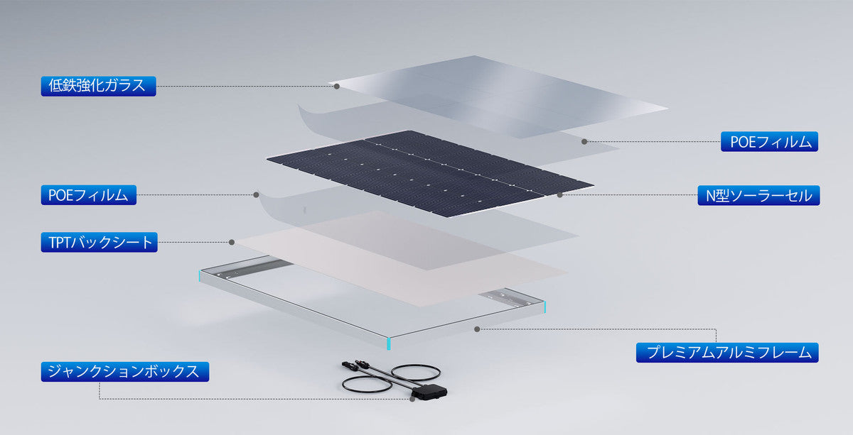 精密に設計されたこのパネルは、低鉄強化ガラス、POEフィルム、N型セル、TPTバックシート、IP67ソーラーコネクタ、IP65ジャンクションボックス、そして耐久性に優れたアルミフレームを採用しています。これらの高品質なコンポーネントが、優れた耐久性と信頼性の高い性能を長年にわたり提供します。
