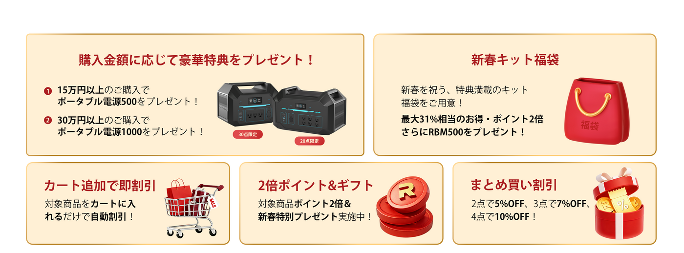 - 15万円上のご注文で、ポータブル電源500Wをプレゼント(先着30名様)