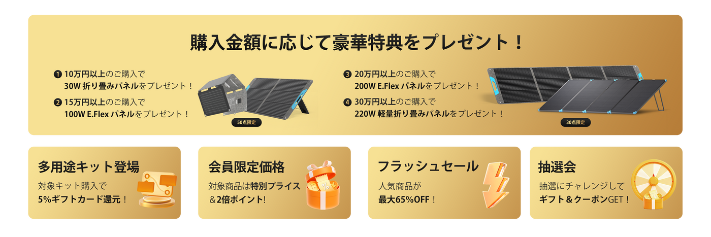- 30万円上のご注文で、220wの軽量折り畳み式ソーラーパネルをプレゼント(先着30名様)